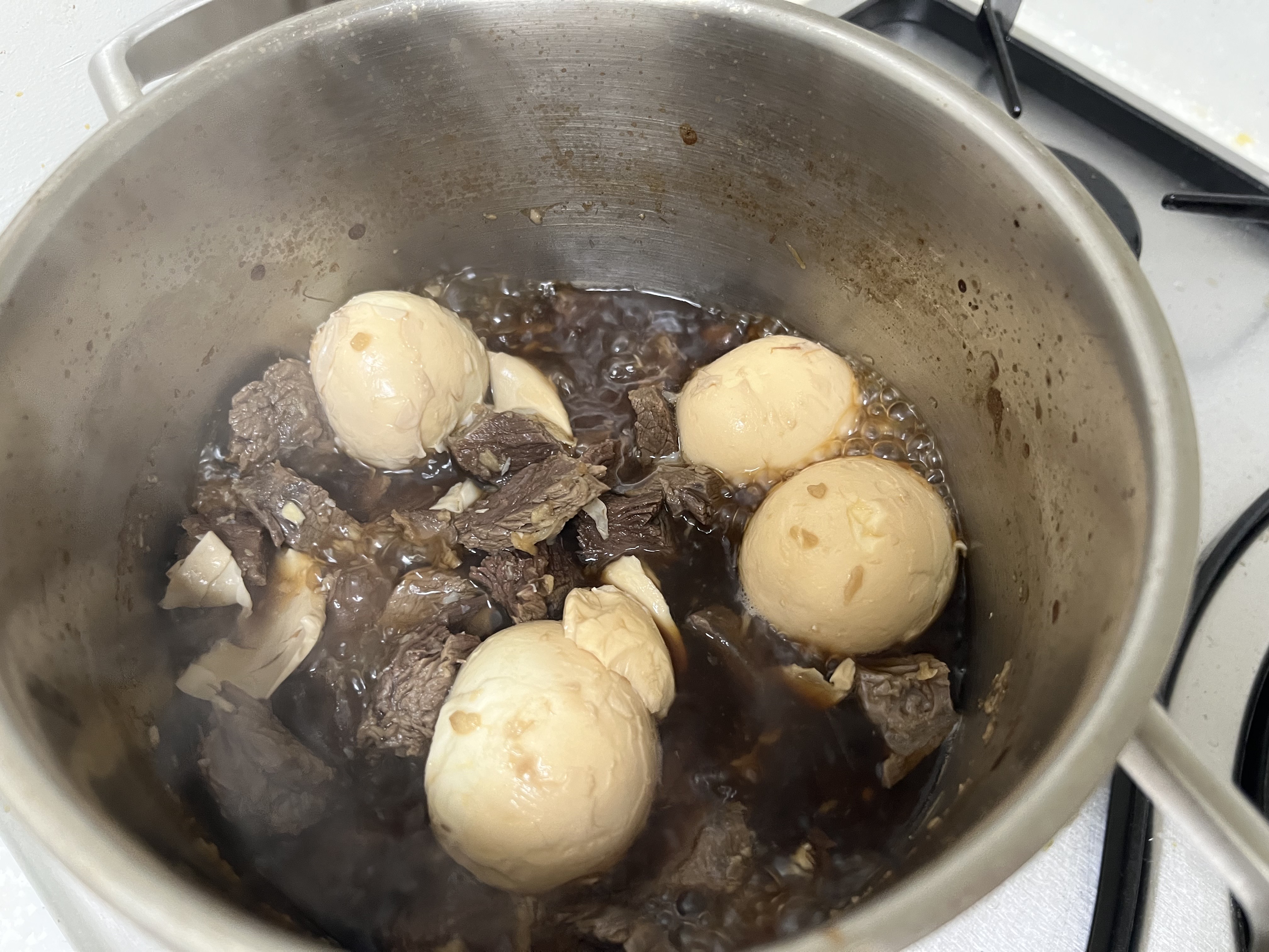 물이 끓어오르면 약한 불로 바꾸어서 계란과 소고기를 넣고 간이 잘 배게 끓여주세요